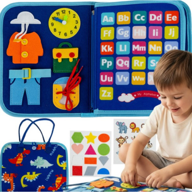 - Розвиток моторики та самостійності - сенсорна книга «Круззель» Монтессорі: пряжки, гудзики, блискавки, липучки і шнурки навчають повсякденним діям.