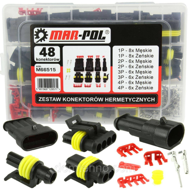 Набір складається з: 1-контактних штекерних та гнездових корпусів (по 8 шт), 2-контактних штирьових і гнездових корпусів (по 6 шт), 3-контактних штирьових і гнездових корпусів (по 6 шт), 4-контактних штирьових і гнездових корпусів (по 6 шт). Це ідеальне рішення для з'єднання внутрішньої проводки вашого транспортного засобу чи іншої техніки, яке може бути застосоване в широкому спектрі.