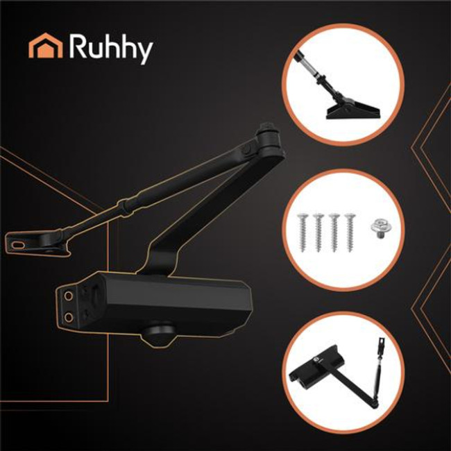 Доводчик RUHHY - надійне та універсальне рішення, яке ідеально підходить для використання як вдома, так і в офісі, готелі, школі або комерційному приміщенні. Завдяки можливості монтування як на праву, так і на ліву двері та здатності підтримувати вагу від 40 до 65 кг, доводчик має широкий спектр застосування та забезпечує комфортне користування.