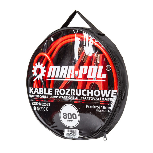 Пускові кабелі Mar-Pol M82533 800А — надійне рішення для швидкого запуску автомобіля з розрядженим акумулятором. З їхньою допомогою ви легко зможете розпочати двигун незалежно від погодних умов. Кабелі довжиною 4 метри і перетином 16 мм² забезпечують стабільну передачу струму до 800 А, завдяки чому цей продукт є універсальним вибором як для бензинових, так і для дизельних двигунів.