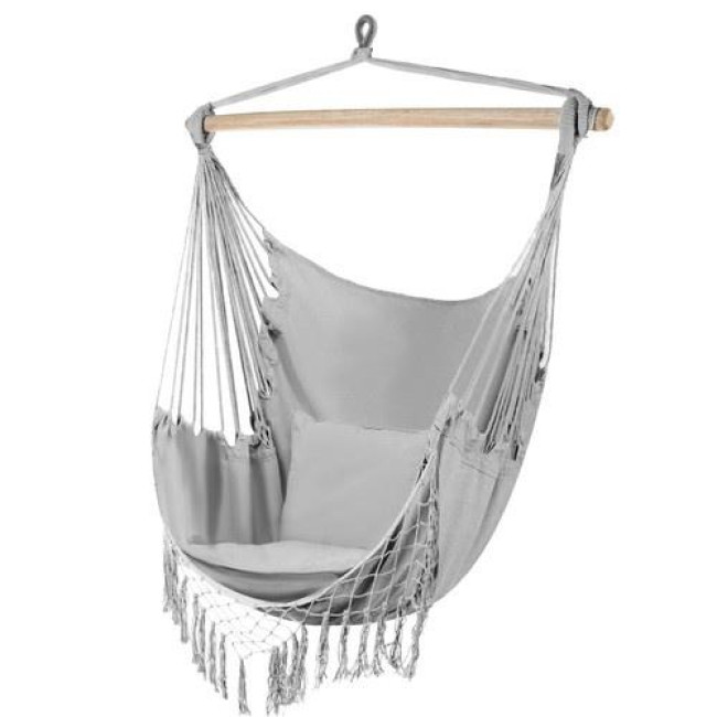 Відчуйте справжній комфорт та релакс з підвісним кріслом-гамаком у стильному сірому кольорі! Цей унікальний елемент стане ідеальним додатком до вашого саду, тераси чи балкона, створюючи затишний куточок для відпочинку після напруженого дня.