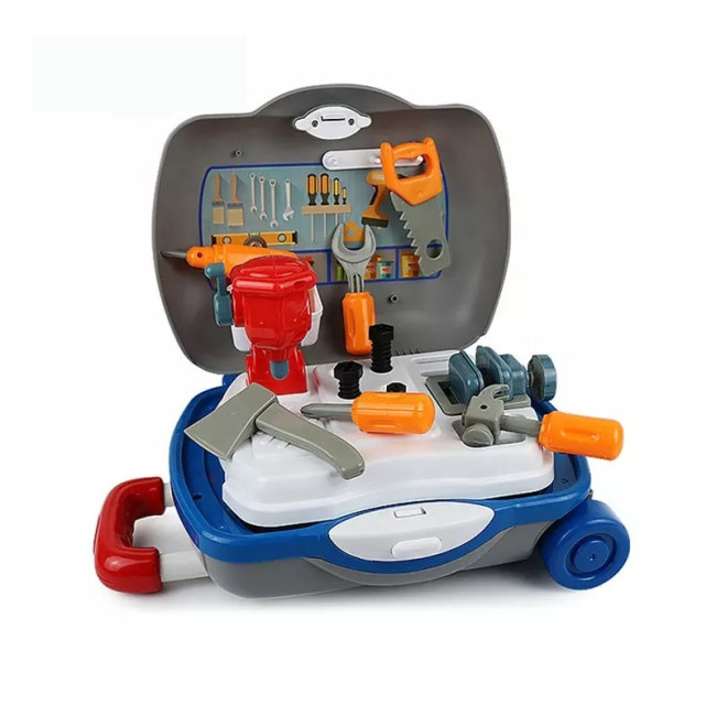 - Комплект інструментів: включає 17 різноманітних елементів, серед яких пила, сокира, викрутка, молоток, гайковий ключ, дриль, шурупи, кошичок для приладдя та лещата.