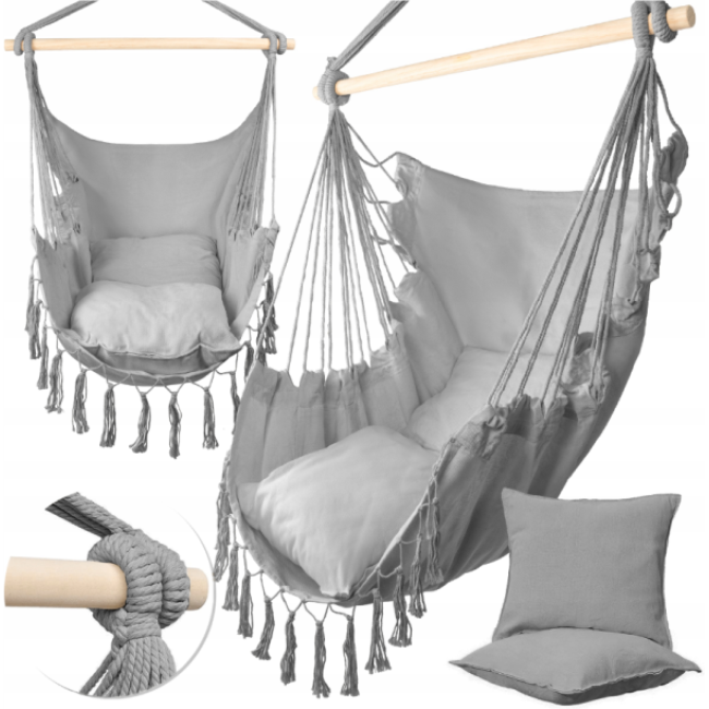 Це крісло гамак стане вашою запорукою відпочинку, даруючи моменти релаксації та затишку. Завдяки сучасному дизайну і нейтральному кольору сірого, він впишеться в будь-який інтер'єр, додаючи шарму і особливості вашому простору.