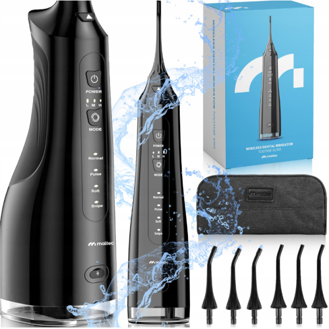 Бездротовий іригатор Maltec Toothie X60 - це революційний інструмент для догляду за ротовою порожниною, який поєднує в собі передові технології та зручність використання. Виконаний у стильному чорному корпусі, цей пристрій працює під тиском до 150 PSI, що дозволяє ефективно видаляти залишки їжі, бактеріальний наліт та інші забруднення навіть з найважкодоступніших ділянок.