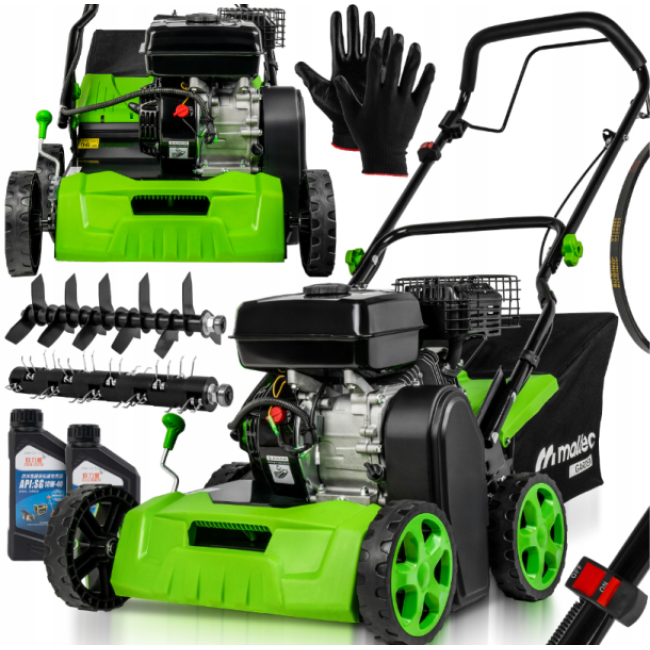 Устройство идет в комплекте с 2 бутылками масла, защитными перчатками и запасным клиновым ремнем, что делает его максимально удобным и функциональным для пользователя. Оно идеально подходит для частого использования и помогает поддерживать ваш газон в идеальном состоянии на протяжении всего года.