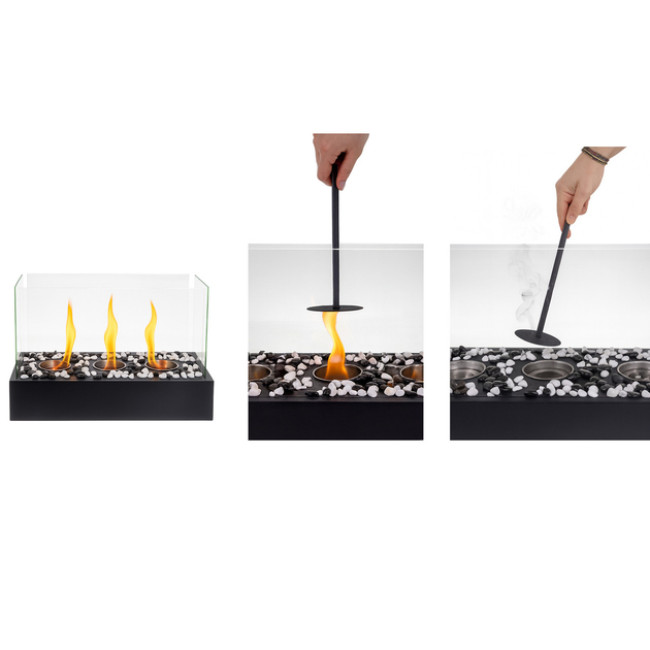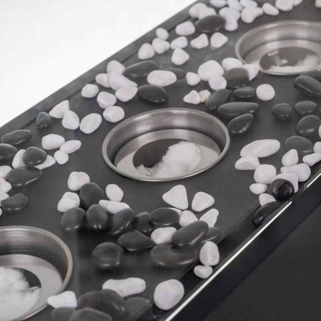 Элегантные белые и чёрные камешки, входящие в комплект, позволяют вам создать уникальный, контрастный визуальный эффект, добавляя биокамину стиля и подчеркивая игру света и теней. Дополнительно, комплектуется чёрным гасителем, который обеспечивает быстрое и безопасное тушение пламени, гарантируя долговечность и удобство эксплуатации.