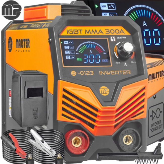 Комплект включает: инверторный аппарат MP-0123, сварочный кабель MMA с держателем электрода, кабель заземления с зажимом, защитный экран со стеклом, щетка с молотком и инструкция. Аппарат также совместим с TIG-сваркой при соответствующих дополнениях.