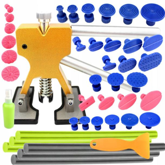 Набор включает в себя PDR съемник с регулируемой ножкой, который обеспечивает точность и контроль во время работы. В комплект также входят 33 адаптера-грибки различных размеров, что позволяет настроить инструмент под конкретные вмятины. Для фиксации адаптеров используются высококачественные термоклеевые палочки, которые обеспечивают надежное сцепление и легкое удаление по завершении работы.