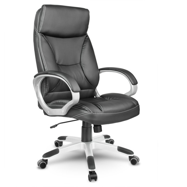 Черная обивка из качественной экокожи дополнена контрастной белой строчкой, которая подчеркивает форму кресла