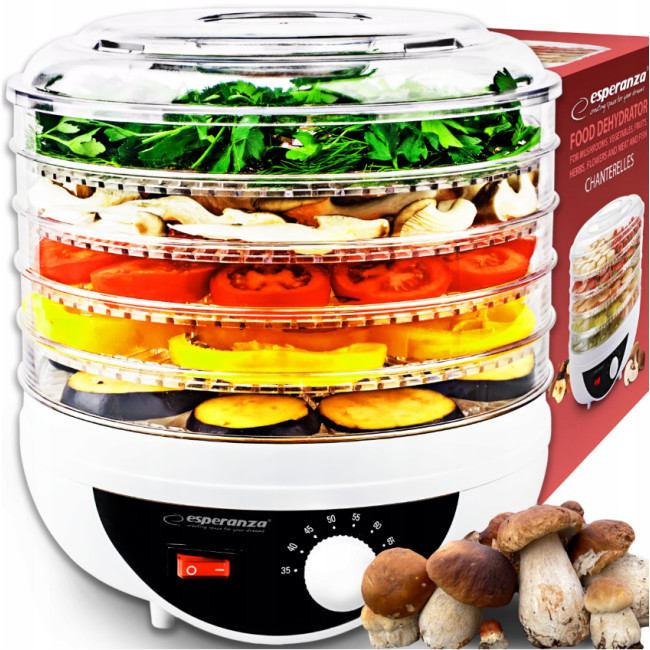 Сушка для фруктов и овощей Esperanza EKD002 – идеальное решение для вашего домашнего обихода, позволяющее хранить и наслаждаться вкусом любимых продуктов круглый год. Эта сушилка соединила в себе инновационную технологию, продуманную конструкцию и удобство в использовании. Если вы цените натуральные и полезные продукты, хотите сохранить их вкус и питательную ценность, эта сушка станет вашим незаменимым помощником.Сушилка Esperanza EKD002 предназначена для бережной и равномерной обработки грибов, фруктов, овощей, трав, цветов, as well as мяса и рыбы. Благодаря многоступенчатому регулятору температуры и мощному вентилятору, процесс осуществляется быстро и эффективно, позволяя сохранить все ароматы и вкусовые качества продуктов. Температура сушки регулируется в диапазоне от 35°C до 70°C, что позволяет подбирать оптимальные условия для разных типов продуктов.