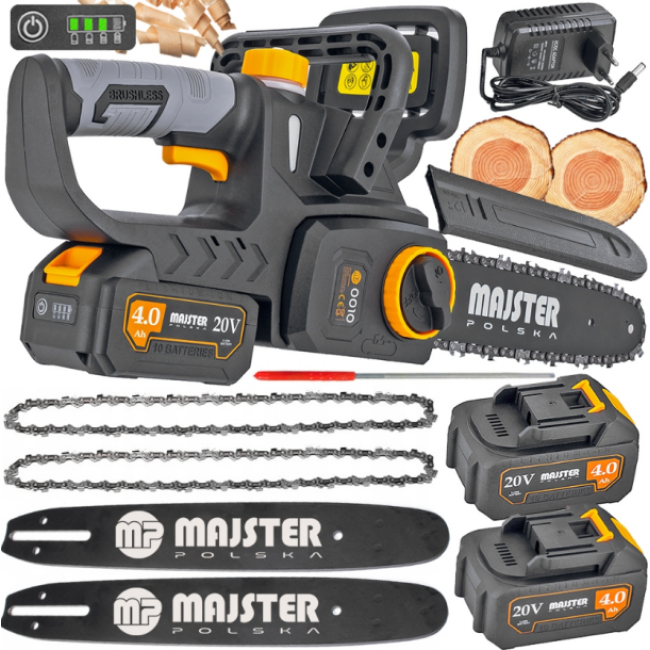 Majster Polska 1200Вт – це незамінний помічник для будь-якого домашнього майстра або садівника. Завдяки простій системі натягування ланцюга SDS, вам більше не доведеться думати про додаткові інструменти для регулювання. Пила також включає в себе два акумулятори об'ємом 4000 мАч, що забезпечують тривалу роботу без підзарядки, та зарядний пристрій.