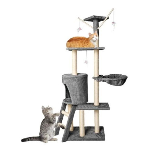 Особлива увага приділена естетиці: сучасний дизайн дозволяє комплексу гармонійно вписуватися в будь-який домашній інтер’єр. Вибір сірого кольору робить його універсальним рішенням для будь-якої кімнати. Високий домік з 5 рівнями дозволяє котам лазити, відпочивати та навіть полювати на три пухнасті іграшкові мишки, що додатково стимулює до активності та ігор.