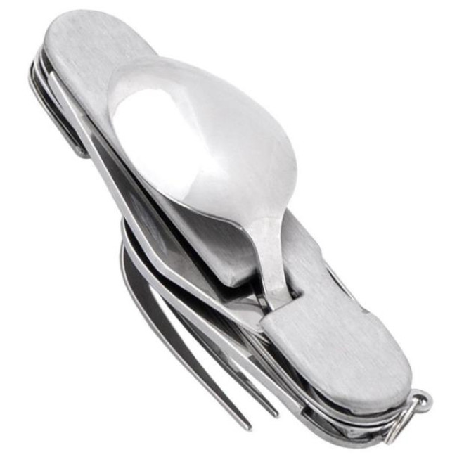 - Багатофункціональність: ложка, виделка, ніж, штопор, відкривачка для пляшок і банок та шило в одному комплекті.