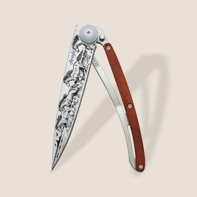 Карманний ніж DEEJO 37G Coral wood / Wild horses - це не просто інструмент, це символ елегантності та стилю. Витончена лазерна гравіровка у вигляді диких коней додає цьому ножу справжній неповторний шарм. Виготовлений з високоякісної нержавіючої сталі марки Z40C13, ніж має надзвичайно легку вагу, лише 37 г, що робить його ідеальним вибором для повсякденного носіння і використання. Титанова поверхня надає особливу міцність і захист від дрібних подряпин та механічних пошкоджень, що важливо для активних та діяльних людей.