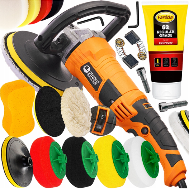 Комплект включає в себе 4 полірувальні губки для різьблення M14, велику губку для миття автомобілів, подвійний повсть для полірування з липучкою, запасні вугільні щітки, пасту ФареКЛ G3 для видалення дефектів з полірованої поверхні. Все те, що потрібне для ідеальної обробки кожної поверхні.