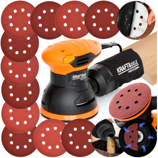 Kraft Dele KD1684 орієнтована на широке коло завдань, включаючи шліфування та полірування деревини, металів, пластмас та інших матеріалів без створення борозен і нерівностей завдяки ексцентриковому руху. Додатково ви отримуєте 10 шт. наждачного паперу різної зернистості (P60, P100, P120), що дозволяє відразу приступити до роботи.
