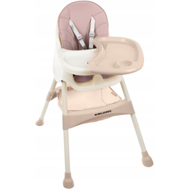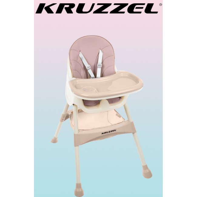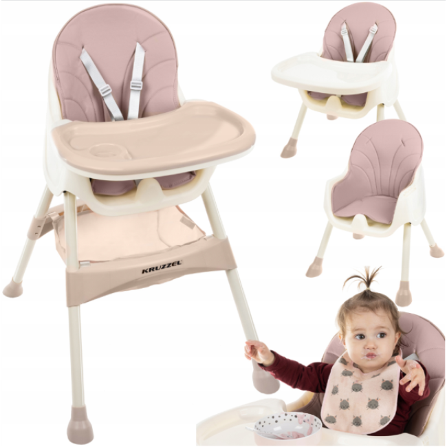 Крісло KRUZZEL 3-в-1 - ідеальне рішення для щоденної годівлі вашої дитини. Крісло легке, м'яке та зручне у використанні. Стілець підходить дітям від 6 місяців. Має знімну оббивку з практичного екошкіри, яку легко чистити та зручно використовувати. Стільниця має 3 рівні регулювання відстані та знімний піднос. Додатковою перевагою є 4 нековзні ніжки з відповідною відстанню між ними, що забезпечують стійкість крісла. Додатковий профільований запобіжний елемент між ніжками, що перешкоджає зісковзування дитини з крісла.