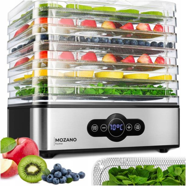 Сушарка MOZANO складається з 6 лотків із нержавіючої сталі із захищеними краями. Їхня особлива конструкція з додатковим вхідним отвором забезпечує вільну циркуляцію нагрітого повітря, скорочує час висихання і запобігає прилипанню.